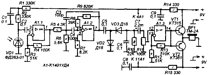 Отраженный сигнал поступает на вход приемника, схема которого показана на рисунке 2. Принятый фотодиодом VD1 сигнал поступает на вход усилителя на собранного на ОУ А1.1, здесь вся полоса принятых частот усиливается в два раза, а также обеспечивается согласование фотодиода с последующими каскадами. На ОУ А1.2 собран активный полосовой фильтр (Л.1), настроенный на частоту 34,67 кГц, т.е. на частоту несущей передатчика. Коэффициент усиления каскада равен 100, полоса пропускания с неравномерностью - Здб - 6,8 кГц, это обеспечивает избирательное усиление несущей и боковых полос. Такое построение схемы позволяет максимально ослабить действие помех и паразитного фона от осветительных приборов. С выхода А1.2 сигнал поступает на амплитудный детектор, построенный по классической схеме, не требующей пояснений. На ОУ А1.3 и транзисторах VT1 и VT2 построен УНЧ, нагрузкой которого служат высокоомные телефоны ТМ-2А или аналогичные. Развязка узлов схемы по питанию осуществляется цепями R1C1, R14C9, R15C8. Налаживание правильно собранной схемы сводится к подстройке частоты передатчика резистором R1 до получения на выходе приемника максимальной амплитуды сигнала. ОУ К1401УД4 не имеет прямой замены среди отечественных микросхем, но вместо А1.1 и А1.2 можно применить любые ОУ с полевыми транзисторами на входе и частотой единичного усиления не менее 2,5 МГц. А1.3 можно заменить на любой ОУ широкого применения. Автор проверял такой вариант : КР574УД2Б и К140УД708. Заметно повысить характеристики приемника можно если применить малошумящие ОУ TLE2074CN и TLE2144CN фирмы Texas Instruments. Цоколевка этих микросхем полностью совпадает с цоколевкой К1401УД4. Светодиод и фотодиод можно взять зарубежного производства для систем ДУ В авторском варианте схема с К1401УД4 обеспечивала уверенный съем информации с расстояния 5-10 метров, вариант с TLE2074CN обеспечивал съем информации с расстояния до 15-20 метров, кроме того этот вариант в силу более низкого уровня шумов позволял уверенно разбирать тихие слова даже на фоне громкой музыки. Чувствительность устройства можно повысить дополнительными ИК-светодиодами, включенными параллельно VD1 передатчика (через свои ограничительные резисторы). Можно также увеличить коэффициент усиления приемника добавив каскад, аналогичный каскаду на А1.2, для этого можно использовать свободный ОУ микросхемы А1. Конструктивно светодиод и фотодиод расположены так, чтобы исключить прямое попадание ИК-излучения светодиода на фотодиод, но уверенно принимать отраженное излучение. Не исключено применение оптических систем, например таких как в Л.2. Питание приемника осуществляется от двух батареек типа "Крона", передатчик питается от четырех элементов типа R20 суммарным напряжением 6В (1,5В каждый). В заключение следует напомнить, что использование этого устройства в некоторых случаях запрещено законодательством РФ и может привести к административной или уголовной ответственности. Литература: