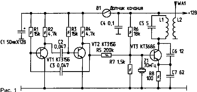 Радиосторож состоит из высокочастотного генератора, модулятора и датчика качания. В дежурном режиме датчик качания разомкнут, и питание подается только на генератор. Приемник, находящийся в квартире, настраивается на несущую частоту генератора по пропаданию шумов в громкоговорителе. Таким образом, даже при отключении аккумуляторе срабатывание радиосторожа определяется по резком) возрастанию шумов, и это также является признаком исправности линии "машина - квартира". При прикосновении к автомобилю кратковременно замыкается датчик качания В1 (Рис.2). Через его контакты подается питание на модулятор и заряжается конденсатор С1.
