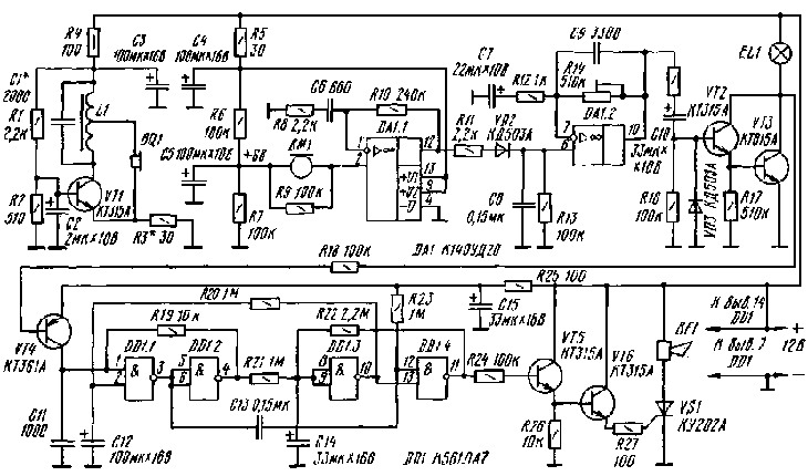 Схема устройства показана на рисунке. Генератор излучателя построен по схеме емкостной трехточки. Излучатель BQ1 включен в цепь обратной связи транзистора VT1. Частота колебаний генератора зависит от резонансной частоты излучателя BQ1 и параметров контура L1 С1. Мощность излучения регулируют подбором резистора R3, а подстройку частоты производят подбором конденсатора С1. Приемник состоит из ультразвукового микрофона ВМ1, усилителя принимаемого сигнала на ОУ DA1.1, детектора на элементах R11, VD2, С8, R13, усилителя продетектированного сигнала на ОУ DA1.2 и транзисторного ключа VT2VT3. Параметры детектора подобраны таким образом, чтобы подавление несущей частоты в диапазоне 25...35 кГц было максимальным, а ослабление низкочастотных пульсации 1...100 Гц - минимальным. Цепь C7R12C9R14 задает коэффициент усиления и полосу пропускания ОУ DA1.2. При появлении переменного напряжения на его выходе положительная полуволна через конденсатор С10 открывает транзисторный ключ VT2VT3, а отрицательная полуволна через диодУОЗ перезаряжает конденсатор С10. Сигнальное устройство включает в себя триггер Шмитта на элементах DD1.1, DD1.2, узел управления на элементах DD1.3, DD1.4, усилитель тока на транзисторах VT5, VT6, тиристор VS1 и излучатель звукового сигнала BF1. При включении питания заряжается конденсатор С12. Примерно через 1...1.5 мин на выводе 2 элемента DD1.1 возникает высокий уровень. Теперь, если сработает детектор перемещения, транзисторы VT2, VT3 и VT4 откроются, высокий уровень на выводе 1 элемента DD1.1 переключит триггер. На выходе DD1.1 возникнет низкий уровень, а на выходе триггера (вывод 4 DD1.2) - высокий. Цепь C13R23 задает длительность короткого звукового сигнала - 0,1 с, а цепь R21C14 - задержку подачи длительного звукового сигнала - 60 с. Цепь R20C12 определяет длительность звукового сигнала и задержку работы устройства после включения питания. Потребляемый ток в дежурном режиме не превышает 70 мА, а в режиме подачи звукового сигнала - 1...2А. В качестве излучателя BQ1 и приемника ВМ1 использованы биморф-ные пьезоэлементы, настроенные на одну и ту же резонансную частоту, например 34 кГц. Расстояние между пьезоэлементами должно быть 3...5 см. Между ними необходимо проложить звукоизоляционную прокладку из поролона. В принципе,если не найдется биморфных пьезоэлементов, можно применить обыкновенную высокочастотную динамическую головку и микрофон, снизив при этом частоту излучения вплоть до 10 кГц. Но это ухудшит помехозащищенность устройства, так как ухудшится частотная избирательность приемника. Также станет слышен излучаемый звук, но для охраны небольших закрытых помещений, объектов, например автомобиля, чувствительности окажется вполне достаточно, а звуковое излучение будет хорошо экранировать корпус автомобиля. В таком варианте конструкцию генератора необходимо изменить. Звуковая сирена BF1 - автомобильный сигнал с током потребления 1...2 А. Катушка L1 намотана на ферритовом кольце марки М2000 размерами 20х12х6 и содержит 100 витков провода ПЭВ-0,3 с отводом от середины. Корпус устройства должен быть сделан с запасом прочности и надежно закреплен на стене внутри охраняемого помещения. Налаживание начинают с настройки генератора. Для этого необходимо отключить приемный пьезоэлемент ВМ1 и подключить его к осциллографу. Расположив пьезоэлементы друг против друга и подав питание на генератор, подбором конденс