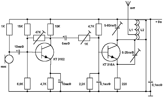 Радиомикрофон 80-110 MГц на транзисторах КТ3102, КТ316