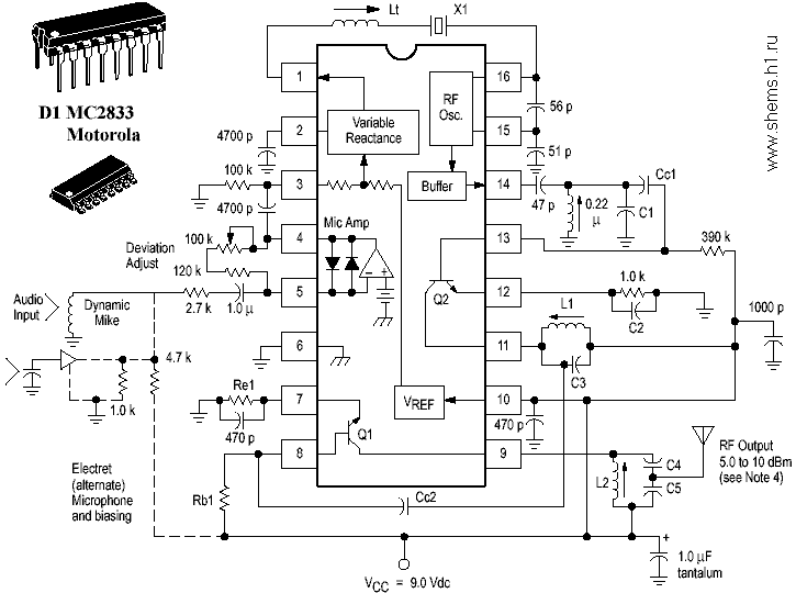 Т.к. приходит много писем по-поводу данной схемы - привожу дополненный рисунок, а также схему стандартного подключения и рисунки печатных плат для него. Данные взяты с сайта Motorola. Данную микросхему на радиорынке в Киеве я без проблем купил за 10 грн. (около $2). Если у Вас есть желание просмотреть оригинальное описание микросхемы, представленное фирмой Motorola - можете (395 kB).