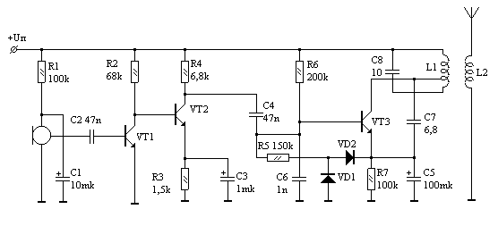 Для наиболее эффективного и рационального использования емкости батарей, для увелечения времени работы передатчика без замены элементов питания, рекомендуется использование активных (включающихся по аккустическому сигналу) закладок, потребляющих незначительный ток в режиме ожидания. Преобразованный звуковой сигнал с микрофона поступает на двухкаскадный усилитель звуковой частоты VT1, VT2, коэффициент усиления которого задается резистором R3, и далее подается на вход генератора VT3. Генератор ВЧ выполнен по схеме индуктивной трехточки. Контур L1C8 настроен на частоту 140 МГц. Последовательная обратная связь осуществляется конденсатором С7. Режим по постоянному току задает резистор R6. Цепочка VD1, VD2, C5 детектирует звуковой сигнал и служит для управления питанием VT3. При помощи резисторов R3, R6 выбирают такое напряжение смещения, чтобы транзистор VT3 в отсутствие звукового сигнала находился в отсечке. Транзисторы VT1, VT2 должны иметь коэффициент усиления не меньше 150, диоды VD1, VD2-германиевые, типа Д9. Катушка L1 содержит 4+1 виток провода диаметром 0,68 мм, намотанных на оправке диаметром 4 мм. Катушка L2 намотана поверх L1 прводом 0,25 мм и содержит 3