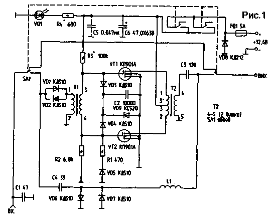 Для изготовления трансформатора Т2 нужны те же кольца - 20 шт, латунные или медные трубки - 2 шт. по 22 мм длиной каждая и наружным диаметром 4 мм. Мною была использована трубка от старой телескопической антенны. Подробно останавливаться не буду, сошлюсь на [I], где есть методика постройки широкополосного трансформатора с короткозамкнутым витком, привожу лишь эскиз расположения выводов трансформатора Т2 (рис.5). Катушка L1 выполнена на цилиндрическом каркасе диаметром 8 мм и длиной 10 мм. Обмотка состоит из 19 витков ПЭЛ-0,16 мм. Намотка - виток к витку. Правильно собранная схема усилителя работает сразу, гок холостого хода усилителя зависит от применяемых транзисторов и выставляется R3. Усилитель работает от источника +12 В, но сохраняет работоспособность при +40 В. Мною были использованы отечественные транзисторы КП901, ток покоя - 200 мА. Увеличение тока покоя ведет к вне-полосным излучениям. При увеличении напряжения питания до +40 В усилитель сохраняет все свои характеристики и работает устойчиво, самовозбуждение замечено не было. На вход усилителя подавалось 0,5 Вт на всех диапазонах, при этом выходная мощность колебалась: на НЧ диапазонах - 6 Вт, начиная с 20-метрового диапазона мощность возрастала до 7 Вт, в среднем - в 13 раз относительно поданной на вход мощности. Проверка производилась на 75-омной нагрузке, а затем с антенной, питаемой 75-омным кабелем. В этом усилителе можно попробовать более современные транзисторы, скажем КП913А, у которых 8=1.0...2,5 А/В - это на порядок выше чем у КП901А. Думаю, результаты будут неплохие. Возникшие вопросы и замечания шлите автору. Литература: Радио. - 1988. - N 12. - С.21. Ю.ИВАНОВ |