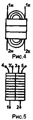 Для изготовления трансформатора Т1 были использованы шесть колец с магнитной проницаемостью 600 НН (до 1000 НН - некритично) типоразмера 7 х 4 х 2, по три кольца склеены клеем БФ2, а затем полученные ферритовые "трубки" складывают бок о бок и тоже заливают клеем. Таким образом, продевая в эти трубки по три витка первичной обмотки и вторичной, получаем трансформатор Т1 (рис.4).