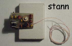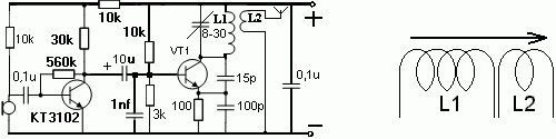 Расположение катушек показано на рисунке 2. Катушки данного радиомикрофона мотаются на оправах диаметром 3 мм, медным проводом 0,7мм. L1 содержит 5 витков, L2 содержит 2 витка. VT1 - КТ368(АМ, А9). Напряжение питания 9 вольт. Радиомикрофон работает на частоте около 95 МГц. Подгонка частоты осуществляеться подстроечным конденсатором 8..30пф. Автор применил резисторы SMD. Антеной служит проводок длиной порядка 40 см. Чувствительность настолько хорошая, что позволяет слушать человека говорящего по телефону в 5-ти метрах от радиомикрофона. Фотография устройства: