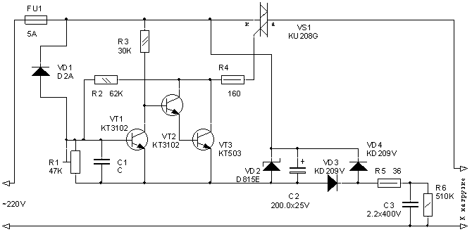 Другой стороной трубка вставлена в отверстие в крышке чайника таким образом, чтобы нагретый воздух и пар попадали в нее. В момент закипания воды возрастает их поток внутри трубки, что и фиксируется термочувствительным элементом. В качестве термочувствительного элемента использован германиевый диод VD1 (рис. 2) с его сильной зависимостью обратного тока от температуры нагрева. При холодном корпусе диода его обратный ток мал и триггер, собранный на транзисторах VT1 - VT3, находится в исходном состоянии, при котором транзистор VT1 закрыт, a VT2 и VT3 - открыты. Открытое состояние транзистора VT3 вызывает отпирание симистора VS1, в результате чего нагревательный элемент чайника подключается к сети. При закипании воды температура внутри трубки повышается, что приводит к увеличению обратного тока диода VD1, в результате транзистор VT1 открывается и триггер переходит в противоположное состояние - транзистор VT1 открыт, а VT2 и VT3 - закрыты. Это приводит к запиранию симистора VS1 и отключению чайника от сети. Для повторного включения необходимо выключить устройство на 5... 10 с и снова включить его. Конденсатор С1 подавляет возможные помехи в цепи датчика температуры, а также обеспечивает правильную установку триггера при включении питания.