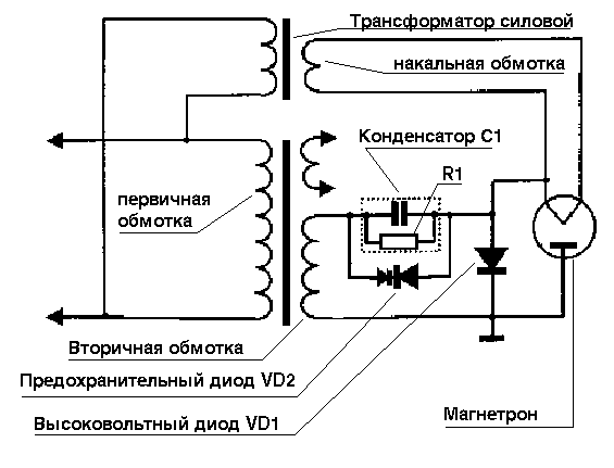 Блок питания магнетрона обеспечивает выработку питающих напряжений: Анодное напряжение Uа = 4000 вольт A = 300 мА. Напряжение накала U = 3,15 вольт А = 10 Ампер. Напряжение ~220 вольт через специальную схему управления подается на первичную обмотку силового трансформатора. Далее с помощью силового трансформатора (который выполняет также роль стабилизатора) напряжение подается на схему удвоения напряжения собранную на VD1, C1. Сопротивление R1 имеет наминал от 1 до 10 Мом и нужно для того чтобы обеспечивать разряд конденсатора С1 при выключенной печи. В импортных конденсаторах резистор монтируется внутри. Предохранительный диод VD2 (фьюз диод) служит для защиты трансформатора от перегрева в случае замыкания в магнетроне или чрезмерном повышении напряжения на конденсаторе С1.