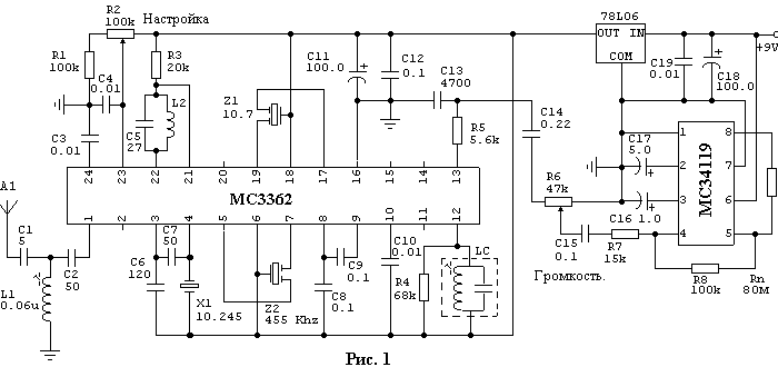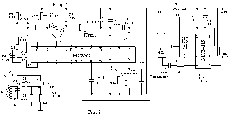 Входной каскад приемника выполнен по традиционной резонансной схеме. Сигнал с антенны А1 через катушку связи L1, поступает во входной контур L2. Индуктивная связь с антеной выполнена не случайно, т.к. это единственный способ обеспечить нормальное согласование с различными антенами и в широком диапазоне частот [1,6,7]. Для снижения эффекта шунтирования контура L2 входными цепями, и повышения его добротности, а следовательно сужения полосы пропускания и повышения избирательности, применено неполное включение контура. В качестве усилительного элемента используется полевой транзистор КП307Г. Указанный транзистор имеет высокую крутизну характеристики и приемлемые шумовые показатели. Такие же характеристики имеет двухзатворный КП350, но он сильно боится статического электричества, к тому же требует дополнительных элементов для обеспечения смещения на втором затворе. Все остальные транзисторы показали более худшие результаты и по усилению и по шумам. Усиленный сигнал выделяется на контуре L3, который по тем же соображениям, что L2, имеет неполное включение. С контура L3, через катушку связи L4 сигнал поступает в смеситель. Такая схема обеспечивает минимальное взаимное влияние УВЧ и смесителя, повышает избирательность, и обеспечивает максимальное согласование с входным каскадом смесителя, выполнего по дифференциальной схеме. От внутреннего гетеродина в смеситель поступает опорная частота. Опорными элементами гетеродина являются C7L5 и встроенная варикапная матрица, изменяя напряжение на которой резистором R6, можно осуществлять незначительную перестройку по частоте. Резистор R5 предназначен для создания "растяжки". В принципе R5,R6 и C6 можно ислючить, соеденив 23 ножку MC3362 с положительным проводом, а перестройку осуществлять элементами C7 и L5. С 20 ножки сигнал гетеродина может быть подан на синтезатор частот, а управляющее напряжение должно подавться в таком случае на 23 ножку. Сигнал разносной частоты в 6,5 Мгц (но может быть и 10,7 Мгц и 5,5 Мгц, это проверялось) подается на пьезокерамический фильтр Z1 и далее, минуя первый УПЧ и второй преобразователь, на второй УПЧ, ограничитель и фазовый детектор. С фазового детектора, через ФВЧ на С13R9, обеспечивающих срез частот выше 5 Кгц [2,3], сигнал поступает на усилитель НЧ, выполненый по мостовой схеме, на микросхеме MC34119. В отличие от 174 серии этот усилитель имеет значительное усиление, высокую устойчивость к самовозбуждению, низкий уровень собственных шумов, очень высокий КПД и малое количество навесных элементов. Выходная мощьность на нагрузке 20 Ом составляет около 0,2 Вт. Если приемник планируется использовать как широкополосный вещательный, то рекомендую изменить значения C13R9 на основе рекомендаций [2,3], либо исключить эту цепь вообще. Детали и конструкция. К сожалению, вариант приемника не был доведен до "коробочного" варианта. Во-первых этого и не требовалось, а во-вторых, автору гораздо интереснее процесс "познания и созидания", нежели "причесывания и вылизывания". Поэтому печатную плату, желающим повторить данную конструкцию, придется разводить самим. Кстати сказать, это приходится делать даже и при наличии рисунка, т.к. зачастую нет тех элементов, которые использовал автор. Да и схема достаточно проста, поэтому трудностей с этим быть не должно. Макетная плата которую использовал автор имеет размер