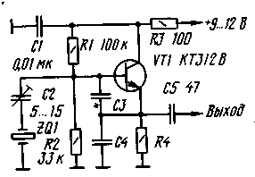На рис. 2 приведена схема генератора, в котором кварцевый резонатор возбуждается на нечетных гармониках его основной рабочей частоты [2]. Как и в предыдущем варианте, входное сопротивление следующего каскада должно быть не менее 1 кОм. Выходное напряжение - примерно 0,5 В. Для полосы частот 15...25 МГц емкости конденсаторов С2, СЗ и С4 должны быть соответственно 100, 100 и 68 пФ; для 25...55 МГц - 100, 68 и 47 пФ; для 50...65 МГц - 68, 33 и 15 пФ. Катушку L1 наматывают проводом диаметром 0,3 мм на каркасе диаметром 5 мм. Она имеет подстроечник из карбонильного железа (диаметр - 4 мм). Для трех указанных выше полос рабочих частот число витком должно быть соответственно 15, 10 и 7.