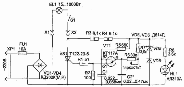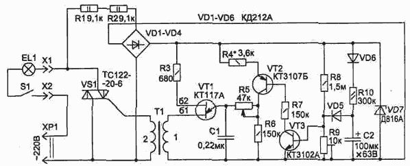 Вторая схема позволяет не только регулировать напряжение на лампе, но и обеспечивает плавное нарастание яркости свечения до значения, установленного резистором R7. Это значительно продлевает срок службы лампы за счет устранения перегрузки в момент включения. Кратковременная перегрузка лампы возникает из-за того, что нить накала в холодном состоянии имеет на порядок меньшее сопротивление, чем нагретая. Настройка схемы регулировки яркости выполняется аналогично уже описанной выше, для чего коллектор VT3 временно закорачиваем на общий провод — транзистор VT2 будет в насыщении. После настройки регулятора яркости, при отключенном диоде VD5, подбором номинала резистора R10 добиваемся, чтобы при положении регулятора яркости "максимум" лампа чуть светилась. Теперь можно подключать диод VD5 и проверять работу устройства. При включении схемы (S1), если регулятор (R7) установлен на максимальную яркость, свечение лампы будет плавно возрастать в течение 1...2 секунд.