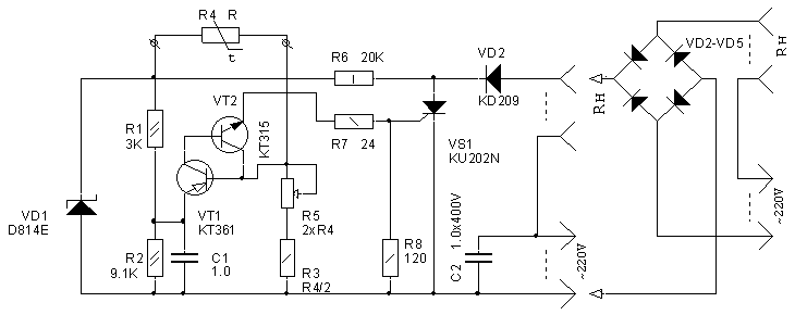 Авторский вариант описанной здесь конструкции используется для регулирования температуры в домашнем инкубаторе, поэтому для повышения надежности при открытом тринисторе VS1 подключенные к нагрузке осветительные лампы (четыре параллельно включенных лампы мощностью 60 Вт на напряжение 220 В) горят в полнакала. Эксплуатируя устройство в режиме регулятора освещенности, к точкам А-В следует подключить мостовой выпрямитель VD2- VD5. Его диоды подбирают в зависимости от регулируемой мощности.