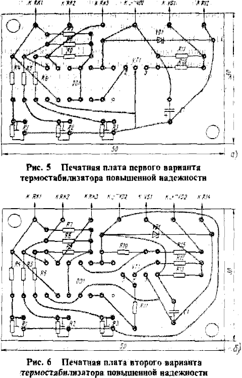 Отличием стабилизатора по схеме рис. 58 является подключение терморезисторов к плюсовому проводу питания, что необходимо для того, чтобы сигналом включения нагревателя был лог.0 на выходе элемента DD1.1. Это, в свою очередь, необходимо для того, чтобы элемент DD1.2, выполняющий функцию ИЛИ для сигналов высокого логического уровня или функцию И для сигналов низкого уровня за счет подключения одного из его входов к плюсу питания, выдавал на своем выходе сигнал, включающий тиристор, лишь в те моменты, когда напряжение сети близко к нулю. Для этого же на вход элемента DD1.2 подано через делитель R15R10 напряжение с выхода выпрямительного моста VD2. Поскольку сигналом, включающим тиристор, теперь является лог.0 на выходе элемента DD1.2, усилитель тока на транзисторе VT1 выполнен по схеме инвертора. В термостабилизаторах могут быть использованы терморезисторы типов ММТ или КМТ, оксидный конденсатор любого типа, любой стабилитрон на напряжение 8...10 В, практически любые маломощные кремниевые транзисторы соответствующей структуры. Микросхему К561ЛП13 можно заменить на К561ИК1 [З], подключив ее два управляющих входа к общему проводу. Резистор R 12 (рис. 57) составлен из двух резисторов 24 кОм 2 Вт, включенных параллельно. На рис. 59 и 60 приведены чертежи печатных плат описываемых термостабилизаторов, на них размещены только слаботочные элементы устройств. Платы рассчитаны на применение подстроечных резисторов типа СПЗ-19а, размер плат - 30х50 мм. Подключение входов элемента DD1.3, показанное на схеме рис. 57, объясняется удобством разводки печатной платы; как известно, входы неиспользуемых элементов микросхем КМОП нельзя оставлять свободными. Вариант силовых цепей, схема которого приведена на рис. 57 и 58, обеспечивает работу с нагревателем до 100 Вт, например, теплоизолированного ящика для хранения овощей на балконе, при этом установка тиристора VS1 на теплоотвод не требуется. При необходимости коммутации более мощного нагревателя следует использовать более мощные диоды и тиристор и установить их на соответствующие радиаторы. Настройку термостабилизаторов для исключения поражения электрическим током следует производить с использованием маломощного понижающего трансформатора с напряжением на вторичной обмотке 26...28 В. Параллельно резистору R12 для устройства по схеме рис. 57 или R14 для стабилизатора по схеме рис. 58 подключить резистор с номиналом 750 Ом на мощность не менее 0,5 Вт. Вместо нагревателя подключить лампу накаливания на рабочее напряжение 27 В. Один из терморезисторов RK1 - RK3 отключить, выводы второго Замкнуть между собой, третий поместить в сосуд с водой с температурой, которую необходимо стабилизировать.