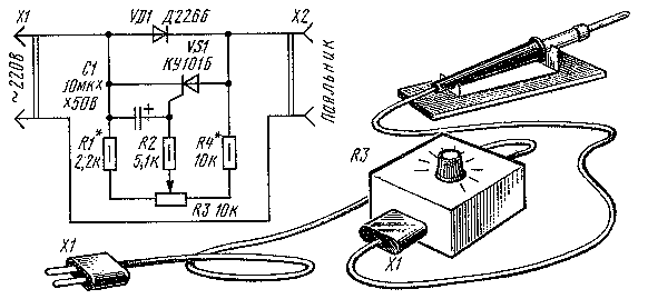 Первая из конструкций (рис. 1) позволяет плавно регулировать температуру нагрева жала паяльника. В регуляторе - маломощный тринистор и такой же выпрямительный диод, включенные встречно- параллельно и установленные в разрыв одного из питающих проводов паяльника. При положительном полупериоде напряжения на верхнем по схеме штыре вилки X1 ток проходит через диод VD1 и нагрузку (паяльник), включенную в розетку X2. При отрицательном полупериоде напряжения на указанном штыре диод закрыт и тока через нагрузку нет. Если бы отсутствовала цепь из тринистора VS1, конденсатора С1 и резисторов R1 - R4, на нагрузке выделялась бы мощность вдвое меньше той, которая была бы при непосредственном питании от сети. Благодаря же использованию тринистора с дополнительными деталями появляется возможность шунтировать диод, когда он закрыт, и пропускать через нагрузку дополнительный ток. Причем этот дополнительный ток можно регулировать переменным резистором R3, изменяя фазу открывания тринистора. В итоге будет изменяться средний ток, протекающий через нагрузку, а значит, выделяющаяся на ней средняя мощность. Если при вставленной в сетевую розетку вилке XI и включенном в гнезда Х2 паяльнике измерить на нем переменное напряжение, то при перемещении движка резистора в крайние положения стрелка вольтметра зафиксирует изменение напряжения примерно от 150 до 210 В. Естественно, включив в гнезда Х2 настольную лампу, можно изменять яркость ее свечения. Как в первом, так и во втором вариантах мощность нагрузки не : должна превышать 30 Вт.