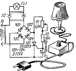 В значительно более широких пределах можно изменять напряжение на нагрузке с помощью регулятора, показанного на рис. 2. Нагрузка (настольная лампа) в нем включена в сеть через диодный мост на диодах VD1 - VD4. Диоды включены так, что пока закрыт тринистор VS1, ток через лампу не течет. Выпрямленное мостом напряжение приложено к аноду и катоду тринистора и одновременно поступает на зарядную цепь, состоящую из резисторов R1, R2 и конденсатора С1. Как только конденсатор зарядится до определенного напряжения, тринистор откроется и замкнет диагональ моста. Через нагрузку потечет ток. Такое случается при каждом полупериоде сетевого напряжения. Момент открывания тринистора, иначе говоря <порция> поступающей на нагрузку электроэнергии, зависит от емкости конденсатора и общего сопротивления резисторов. Изменять эту <порцию> можно переменным резистором. Вместо диодов Д226Б подойдет готовый выпрямительный мост КЦ402 - КЦ405 с буквенными индексами А - С, Ж, И. Если с диодами мощность нагрузки не должна превышать 100 Вт, то с мостом она может достигать 400 Вт. Если же нагрузка менее 100 Вт, тринистор может быть КУ201К или КУ201Л. Конструкция этого регулятора ничем не отличается от предыдущего. При проверке его и градуировке шкалы резистора помните, что пределы изменения напряжения на нагрузке составляют 40...210 В.