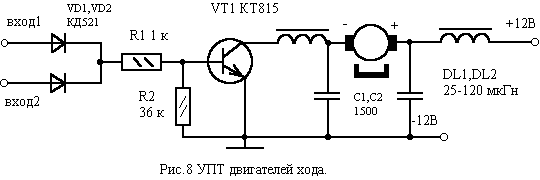 Для управления двигателями используются ключи-формирователи см. рис.8. Дросселя и конденсаторы необходимы для подавления помех со щеток коллекторного двигателя. Диоды на входах играют роль схемы ИЛИ, для запуска двигателей хода от различных выходов демодулятора. Это необходимо для включения двигателя в одиночном режиме (левый-правый) и в совместном режиме (ход). Для включения двигателя редуктора необходим другой ключ, со схемой фиксации. Это необходимо потому, что редуктор работает в режиме сброса груза и в режиме разбрасывания корма. Сброс и подъем груза может осуществляться при выключенных двигателях хода. А разбрасывание корма должно происходить при работающих двигателях. А так как схема управления допускает работу только того устройства, кнопка которого нажата на пульте управления, возникла необходимость установки триггера. Смотрите рисунок 9.