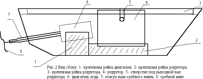 Крепежные рейки нужны для крепления к ним двигателей хода, редуктора, антенны, палубы и корпусов электронной начинки. Начинать надо с реек крепления двигателей хода. Деревянные рейки 1, сечением 30х30 мм, устанавливаются в кормовой части корпуса катера. Смотрите рисунок 2. Отпилите рейку по ширине дна катера на расстоянии 50-60 мм от кормы. В центре рейки выберите круглым напильником (можно рашпилем) место под двигатель. Двигатель должен становиться плотно с небольшим наклоном. Угол наклона двигателя должен быть таким, чтобы вал двигателя образовывал с плоскостью дна угол не более 10 градусов. При большем угле наклона винт не будет развивать полной мощности. Если сделать угол равным нулю, то, не смотря на предпринимаемые меры, возможно попадание воды внутрь корпуса. Кроме того, винт может оказаться выше ватерлинии или на уровне ее. Последнее приводит к кавитации, т.е. захвату двигателем пузырьков воздуха и снижению ходовых параметров катера. Приложите двигатель к рейке и примерно на расстоянии 10 мм от проекции края двигателя, по центру рейки наметьте место установки гаек. Гайки сделаны из шурупов с головкой "впотай" диаметром 6 мм. Оставьте 20 мм шурупа, а остальное отрежьте ножовкой. Просверлите по центру головки отверстие диаметром 2,5 мм и нарежьте резьбу М3. Просверлите отверстие в рейке диаметром 4 мм по месту установки гаек. Смажьте "литолом" целый шуруп и нарежьте резьбу в отверстии рейки. В полученное отверстие можно ввинтить гайку (шуруп с резьбой). Теперь приклейте эпоксидной смолой рейку к днищу корпуса. После застывания смолы прикрепите двигатель к рейке при помощи жестяных хомутов. Для лучшего прилегания двигателя к плоскости, оберните его тонким поролоном. Приложите к валу двигателя спичку или иголку и наметьте место выхода вала винта через корпус по высоте. Вторая, вертикальная метка проходит по центру кормы. Просверлите отверстие диаметром 6,5 мм в корме под кожух вала винта. Кожух вала взят из-под одноразового инсулинового шприца без поршня. Конец шприца, на который надевается игла, устанавливается наружу (7 рис.2). Зашкурьте кожух и корпус возле отверстия. Вставьте кожух в отверстие так, чтобы через него была видна ось двигателя, и залейте эпоксидкой с обеих сторон. Длина выступающей части кожуха 45-50 мм. Важно, чтобы в обоих корпусах угол наклона кожуха вала и длина выступающей части были одинаковыми. Если посмотреть сверху, то ось кожуха должна проходить через нос корпуса. Далее необходимо изготовить и установить крепежные рейки 2 (рис.3) антенны.