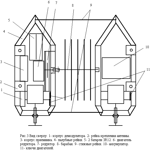Сначала поговорим о корпусах. Корпуса приемника и демодулятора спаяны из жести по размерам плат. Корпус приемника имеет в днище отверстия против контуров для их настройки. Крышки в двух местах прихвачены припоем. К корпусам припаяны кусочки жести с отверстиями под саморезы или шурупы для крепления к палубным рейкам. Корпус 3 приемника (см. рис.3) расположен между крепежными рейками антенны. Корпус 1 демодулятора крепится в кормовой части. Платы 11 ключей двигателей корпусов не имеют и крепятся непосредственно к палубным рейкам. Экранированный вывод антенны с приемника крепится к антенне шурупом крепежа антенны к рейке. В другом корпусе антенны между собой соединены проводом при помощи шурупов. Прежде чем закрепить корпуса электроники необходимо сделать предварительную центровку корпусов катера на воде, с учетом расположения двух плоских батареек и аккумулятора. При этом надо помнить о расположении грузила и бункера с кормом. Для обеспечения непотопляемости катера в случае опрокидывания и самопроизвольного нарушения центровки при транспортировке, свободные места катера заполнены пенопластом. Между двумя корпусами катера по задней стяжке проходит полиэтиленовая трубка Ф6 мм для пропуска проводов.