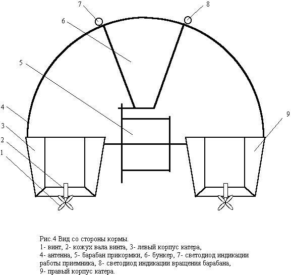 Для простоты управления и максимальной остойчивости, катер сделан в форме катамарана. Корпус вылит из эпоксидной смолы, армированной стеклотканью. Два одинаковых корпуса соединены между собой прутками, из нержавеющей стали. Для изготовления корпуса необходимо сделать его разметку на плотной бумаге. Сначала можно сделать разметку на газетном листе, а потом перенести на ватман. Я не даю размеры корпуса, так как они зависят от грузоподъемности (водоизмещения). А необходимое водоизмещение зависит от типа и веса примененного аккумулятора для питания двигателей. Поэтому, прежде чем приступить к изготовлению корпуса, необходимо определиться с типом (читай - весом) источников питания. Общий вес начинки катера не должен превышать трети от водоизмещения судна. Т.е., ватерлиния (осадка судна) должна быть на одной трети высоты борта. Это желательно при использовании катера во время большой волны применения тяжелых грузил и больших кормушек. Эскиз разметки катера дан на рисунке 1.
