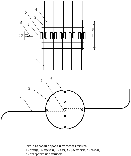 Собственно, барабанов два. Один нужен для сброса и подъема грузила, а второй для разбрасывания прикормки. Общий вид барабана для сброса грузила показан на рисунке 7. Вал барабана сделан из нержавейки диаметром 4 мм. По всему валу 3 нарезана резьба М4. Конец вала (примерно 10 мм) расточен до 3 мм для свободного прохождения во втулку выходного вала редуктора, и имеет отверстие 6 под шплинт. Спицы 1 согнуты из никелированных спиц зонта. Щечки 2 барабана можно сделать из любого нержавеющего материала. У меня у одного барабана щечки пластмассовые, а у другого - алюминиевые (панель прибора). Распорки 4 между щечками можно закрепить пайкой или гайками на резьбе. Все детали стянуты оксидированными гайками 5. Для большей жесткости спицы 1 припаяны к распоркам 4.