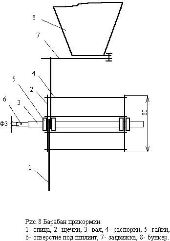 Барабан для прикормки с фрагментом бункера показан на рисунке 8. Этот барабан имеет одну прямую спицу 1 для открывания задвижки 7 бункера 8. Между распорками 4 и валом 3 крест на крест в пазы щечек установлены пластмассовые переборки. Резьба М4 на валу только для закрепления щечек. При вращении барабана спица открывает задвижку, и корм из бункера падает между переборками барабана и равномерно сбрасывается в воду.