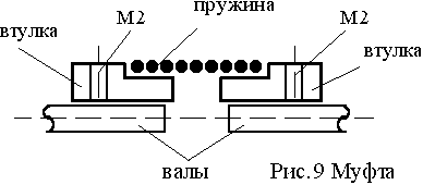 Вал винта сделан из нержавейки диаметром 2,5 мм (взято из рефлектора нагревателя). Длина вала выбирается так, чтобы он выступал из кожуха на 10 мм. Конец вала длиной 20 мм шлифуется, полируется и нарезается резьба М2,5х10 мм. Полировка необходима для свободного вращения вала в узкой части кожуха. Если вращение будет свободным, то в кожух может поступать вода. Соединение вала винта с валом двигателя можно сделать простым, но повозиться с центровкой. Можно сделать посложнее и потратить меньше времени на центровку. Простое соединение - это втулка с просверленными отверстиями под валы, посаженные на эпоксидку. Я делал втулку из алюминиевой проволоки диаметром 4-6 мм. Посредине втулки сверлится технологическое отверстие Ф1,5-2 для выхода излишков эпоксидного клея. Более сложное соединение валов муфтой используют "профессионалы" в высоко оборотистых двигателях гоночных моделей рисунок 9. Конструкция муфты понятна из рисунка. Следует обратить внимание, что пружина навивается так, чтобы при вращении она работала на сжатие втулок. Перед установкой вала винта в кожух необходимо запрессовать половина объема кожуха "литолом".