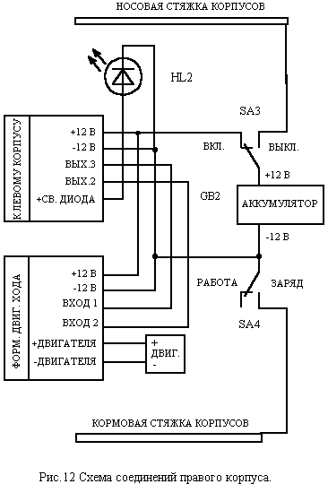Принципиальная схема соединений левого корпуса дана на рисунке 11, а правого корпуса - на рисунке 12. Светодиоды HL1, HL2 крепятся к антенне (рис. 4, поз. 7, 8), а провода к ним проходят вдоль антенны. В местах крепления светодиодов антенны скреплены между собой пластмассовыми стяжками. На эти стяжки устанавливается бункер. Переключатель SA1 в одном положении включает напряжение источника питания, две плоские батареи типа 3R12, а в другом положении подает напряжение на корпус переключателя. Это необходимо для оперативного контроля напряжения. Микросхема стабилизатора напряжения КР142ЕН5А крепится к корпусу приемника. При выключенном напряжении аккумулятора переключатель SA3 подает плюсовое напряжение на носовую стяжку корпусов. В положении "заряд" переключателя SA4 минус напряжения аккумулятора подается на кормовую стяжку корпусов. Таким образом, зарядка аккумулятора и контроль напряжения производится подсоединением зажимов к стяжкам корпусов. Причем, кормовая стяжка используется и для контроля напряжения батареи 9 В. После проверки функционирования и окончательной настройки электроники, сделаем установку палуб. Палубы необходимы для герметизации корпусов катера от попадания забортной воды и осадков. Можно сразу посадить палубы на герметик и притянуть мебельными шурупами, но в процессе испытаний могут потребоваться дополнительные регулировки или центровка. Поэтому советую перед установкой палуб на герметик смазать края тонким слоем жира или любой смазкой. Герметик наносится толстым слоем на палубные рейки, устанавливаются палубы и прижимаются шурупами. После высыхания герметика, палубы легко снимаются и, при последующей установке палуб, места соединений сохраняют герметичность.