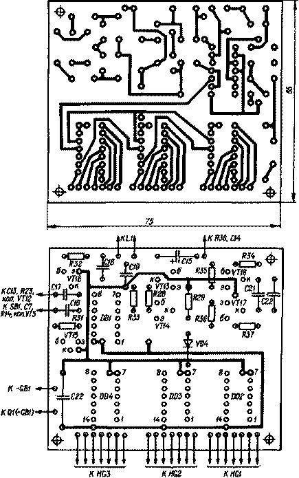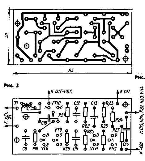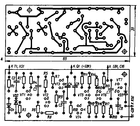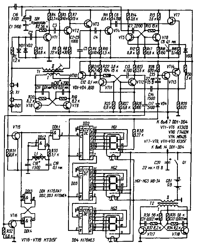 Структурная схема, поясняющая устройство и работу эхолота, показана на рис. 1. Тактовый генератор G1 управляет взаимодействием узлов прибора и обеспечивает его работу в автоматическом режиме. Генерируемые им короткие (0,1 с) прямоугольные импульсы положительной полярности повторяются каждые 10 с. Своим фронтом эти импульсы устанавливают цифровой счетчик РС1 в нулевое состояние и закрывают приемник А2, делая его нечувствительным к сигналам на время работы передатчика. Спадом тактовый импульс запускает передатчик А1, и излучатель-датчик BQ1 излучает в направлении дна короткий (40 мкс) ультразвуковой зондирующий импульс. Одновременно открывается электронный ключ S1, и колебания образцовой частоты 7500 Гц от генератора G2 поступают на цифровой счетчик РС1. ![]() Рис. 1 По окончании работы передатчика приемник А2 открывается и приобретает нормальную чувствительность. Эхосигнал, отраженный от дна, принимается датчиком BQ1 и после усиления в приемнике закрывает ключ S1. Измерение закончено, и индикаторы счетчика РС1 высвечивают измеренную глубину. Очередной тактовый импульс вновь переводит счетчик РС1 в нулевое состояние, и процесс повторяется. Принципиальная схема эхолота с пределом измерения глубины до 59,9 м изображена на рис. 2. Его передатчик представляет собой двухтактный генератор на транзисторах VT8, VT9 с настроенным на рабочую частоту трансформатором Т1. Необходимую для самовозбуждения генератора положительную обратную связь создают цепи R19C9 и R20C11.' Генератор формирует импульсы длительностью 40 мкс с радиочастотным заполнением. Работой передатчика управляет модулятор, состоящий из одновибратора на транзисторах VT11, VT12, формирующего модулирующий импульс длительностью 40 мкс, и усилителя на транзисторе VT10. Модулятор работает в ждущем режиме, запускающие тактовые импульсы поступают через конденсатор С14. ![]() Рис. 2 Приемник эхолота собран по схеме прямого усиления. Транзисторы VT1, VT2 усиливают принятый излучателем-датчиком BQ1 эхосигнал, транзистор VT3 использован а амплитудном детекторе, транзистор VT4 усиливает продетектированный сигнал. На транзисторах VT5, VT6 собран одновибратор, обеспечивающий постоянство параметров выходных импульсов и порога чувствительности приемника. От импульса передатчика приемник защищают диодный ограничитель (VD1, VD2) и резистор R1. В приемнике применено принудительное выключение одновибратора приемника с помощью транзистора VT7. На его базу через диод VD3 поступает положительный тактовый импульс и заряжает конденсатор С8. Открываясь, транзистор VT7 соединяет базу транзистора VT5 одновибратора приемника с положительным проводом питания, предотвращая тем самым возможность его срабатывания от приходящих импульсов. По окончании тактового импульса конденсатор С8 разряжается через резистор R18, транзистор VT7 постепенно закрывается, и одновибратор приемника обретает нормальную чувствительность. Цифровая часть эхолота собрана на микросхемах DD1-DD4. В ее состав входит ключ на элементе DD1.1, управляемый RS-триггером на элементах DD1.3, DD1.4. Импульс начала счета поступает на триггер от модулятора передатчика через транзистор VT16, окончания - с выхода приемника через транзистор VT15. Генератор импульсов с образцовой частотой повторения (7500 Гц) собран на элементе DD1.2. Из резистора R33 и катушки L1 составлена цепь отрицательной обратно