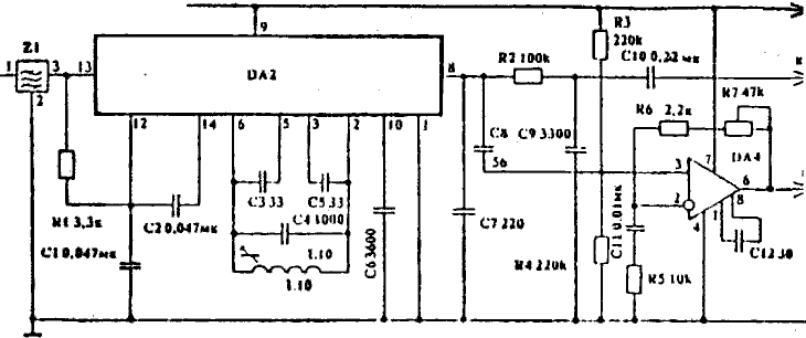 Многие детали радиостанции, без снижения ее параметров, можно заменить. Микросхема DA1 К174ПС1 заменяется микросхемой К526ПС1 или, в крайнем случае, собирается дифференциальный каскад на трех транзисторах КТ315. Микросхему DA2 К174УР7 можно заменить микросхемами К174УР1, К174УРЗ, К526УР1, дополнив последние операционным усилителем для усиления сигнала шумоподавителя, как показано на рис.2. Транзисторы VT1, VT2, VT4, VT7, VT8, VT9 могут быть любые кремниевые соответствующей проводимости. VT3 - типа КП306, КП350 или КПЗОЗ, КП307 (при исключении резисторов R4, R5 и конденсатора СЗ). VT5 - типа КТ315, КТ316, КТ325, КТ355, КТ399 и т.д.. VT6 - КТ603, КТ608, КТ606, КТ610, КТ904, КТ911. Фильтр Z1 можно заменить любым пьезокерамическим фильтром на промежуточную частоту 465 кГц, при этом резисторы R 15 и R 16 следует выбрать равными входному и выходному сопротивлению фильтра соответственно. Диоды - любые кремниевые из серии КД503, КД522, Д233 и др. Варикапы VDl, VD2 - KB 109, KB 110, KB 124, Д901 с любым буквенным индексом. Светодиоды HL1, HL2 - АЛ102, АЛ307, АЛ336, АЛ341. Микросхему DA3 К174УН4А можно заменить на К174УН4Б. К174УН7, К 174УН14 с соответствующей схемой включения, или собрать усилитель низкой частоты на транзисторах. При замене комплектующих следует учитывать, что некоторые из них повлекут за собой увеличение габаритов и потребляемой мощности радиостанции. Налаживание радиостанции следует начинать с приемного тракта. Подав питание, проверяют работу усилителя низкой частоты. При напряжении на выводе 4 DA3 100 мВ и частоте I кГц на выводе 8 DA3 должно быть напряже-ние около 1 В. Далее, подают сигнал с частотой 465 кГц и девиацией частоты 3 кГц на вывод 1 микросхемы DA2 и настраивают контур L10 на максимальную громкость. Если будет наблюдаться возбуждение микросхемы DA2, то ка-тушку L10 следует зашунтировать резистором сопротивлением 5 - 10 кОм. Затем проверяют работу гетеродина но осциллографу или, приняв его частоту радиоприемником. При необходимости подбирают емкость конденсаторов С 12, С 13, С 15 до получения устойчивой генерации на третьей механической гармонике кварца ZQ1. Затем проверяют напряжение на истоке VT3. Оно должно быть около 0,5 В. Подав сигнал с рабочей частотой на соединитель XSI, вращением сердечников настраивают катушки L2 и L3 в резонанс. Затем измеряют чувствительность приемного тракта. Она должна быть не хуже 0,3 - 0,5 мкВ при отношении сигнал/шум на входе 3:1. Настройка передающего тракта начинается с задающего генератора. Временно закорачивают катушки L5 и L6 перемычками и подают напряжение питания на передатчик. Напряжение на светодиодах HL1, HL2 должно быть в пределах 3,5 - 4В. Вращая сердечник катушки L8, настраивают ее на максимум выходного. сигнала, контролируя его уровень по ВЧ вольтметру на коллекторе VT5. Растягивая и сжимая витки катушки L9, предотвращают возбуждение задающего генератора на первой гармонике кварца. Затем, подключив в качестве эквивалента антенны резистор сопротивлением 50 Ом и мощностью 0,25 Вт, растяжением сжатием витков катушек L12 и L13 добивают максимального выходного напряжения на не Оно должно быть не ниже 5 7В. Затем настраивают модулятор, предварительно удалив перемычки с катушек L5 и L6. Вместо резистора R3 временно впаивают переменный резистор сопротивлением 47 кОм. И меняя его сопротивление и контролируя частоту сигнала по радиоприемнику, настраивают передатчик на нужную частоту. Зажав кнопку SB1 контролируют напряжение низ