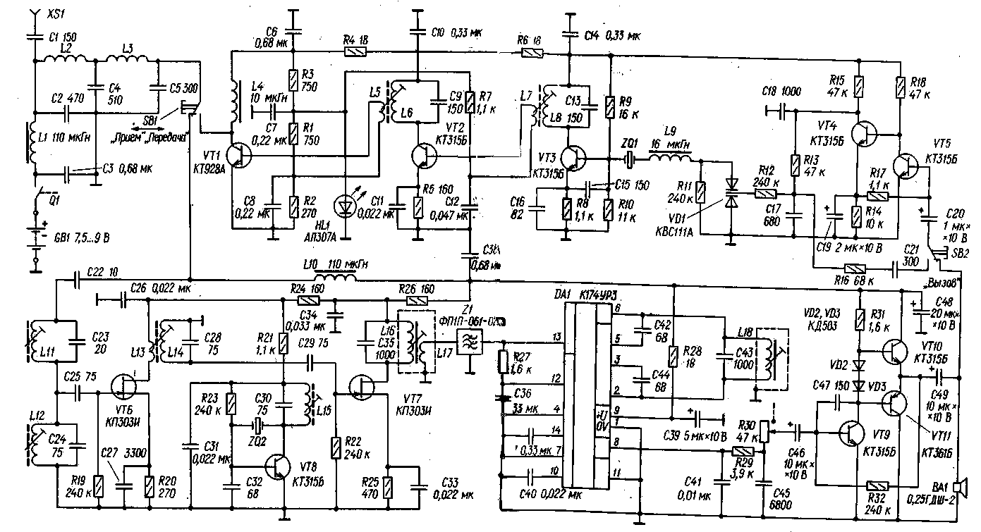 У этой радиостанции, созданной несколько лет назад известным радиолюбителем-конструктором Владимиром Тимофеевичем Поляковым (RA3AAE), типичная, увы, для многих хороших разработок судьба. Когда у нас в стране была разрешена личная радиосвязь, заполнение рынка радиостанций пошло в основном за счет импорта. Слов нет - современные многоканальные радиостанции с синтезатором частоты и различными сервисными удобствами просто хороши. Но и цена им "очень неплохая". Не по карману они сегодня многим потенциальным пользователям. А простых и соответственно дешевых радиостанций "на западе" сегодня уже не выпускают. Не радует такими радиостанциями и отечественная промышленность. То, что выпускается, .громоздко и ненадежно в эксплуатации и относительно дорого. Начиная работу над этой радиостанцией В.Поляков поставил перед собой задачу - разработать простую в повторении конструкцию. В результате была создана небольшая (габарита 170х66х32 мм), и легкая (масса 350 г) радиостанция, позволяющая обеспечить связь с однотипной на расстояние примерно 1,5 км при использовании встроенной телескопической антенны и до 3 км с внешней антенной длиной 2,5...3 м. Принципиальная схема радиостанции показана на рисунке.
