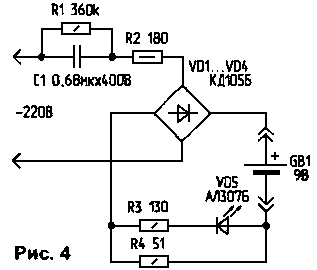 Зарядное устройство для аккумуляторов Д-0,55, НГКЦ-0,5 можно выполнить по схеме, приведенной на рис.4. Для аккумуляторов Д-0,25 емкость конденсатора С1 надо уменьшить до 0,47 мкФ.