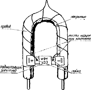 Для восстановления нарушенного контакта я поступаю так беру отрезок тонкого нихромового провода (подойдет и голый медный) и равномерно наматываю на баллон лампы 8...10 витков (см. рис.). Концы провода облуживаю (в качестве флюса использую лимонную кислоту) и припаиваю к металлическому контакту поджигающего электрода.