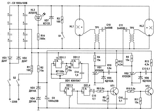 На рис.1 приведена принципиальная схема стробоскопа с двумя лампами, которые вспыхивают поочередно. Стробоскоп собран в виде двух отдельных блоков. Блок управления лампами выполнен в одном корпусе, а лампы-вспышки выполнены в виде отдельных блоков и могут выноситься и устанавливаться в различных местах. Лампы питаются от одного общего блока конденсаторов большой емкости, этот блок постоянно подзаряжается от сети 220 В через схему удвоения. Задающий генератор собран на двух элементах DD1.1 и DD1.2. он генерирует прямоугольные импульсы с частотой 5...20 Гц. Частоту можно плавно регулировать резистором R7. Элементы DD1.3 и DD1.4 работают как триггер, управляя транзисторами VT1. VT2. Сигналы управления поступают на управляющие электроды тиристоров VS1, VS2. открывая их поочередно. Мощные импульсы управляющего напряжения поступают через разделительные конденсаторы СЮ. СП на высоковольтные трансформаторы ТР1. ТР2. которые осуществляют поджиг ламп HL1. HL2. Газ в лампе ионизируется и происходит мощная вспышка света, при этом разряжается накопительная емкость, состоящая из блока конденсаторов С1-С8. Конденсаторы заряжаются от сети через токоограничивающий резистор R1. Переключатель S1 служит для разрядки блока емкостей через резистор R3 после окончания работы. Это необходимо для предотвращения поражения электрическим током, когда стробоскоп находится в выключенном состоянии. Устройство питается от сети 220 В без применения трансформатора. Дня питания цепей управления применен параметрический стабилизатор. Он собран на токоограничивающем резисторе R2 и стабилизаторе на VD3, VD4, С9. Уровень питающего напряжения равен 14 В. Импульсные трансформаторы ТР1 и ТР2 изготавливают самостоятельно. В качестве сердечника применен ферритовый стержень диаметром 8 мм и длиной 30 мм из феррита марки 600НН. Первичная обмотка (I) содержит 30 витков провода ПЭТВ 0,25; вторичная (II) — 2500 витков ПЭЛШО 0,1. При намотке вторичной обмотки каждый слой изолируется конденсаторной бумагой. Поджигающим электродом для лампы ИФК-2000 служат 10 витков проволоки диаметром 0,5 мм. намотанных вокруг колбы. Детали стробоскопа находятся под напряжением сети, поэтому корпус и