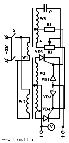 Радиолюбителю нужны не только транзисторы, конденсаторы, микросхемы. Часто просто необходимо иметь даже такое устройство, как сварочный аппарат. Но они, как правило, огромны и тяжеловесны. Однако выход есть, если изготовить аппарат по описанию в журнале " Изобретатель и рационализатор". Вот что пишет о нем автор. "Думаю, вас заинтересует переносной сварочный аппарат весом всего в 26 кг. Питающее напряжение промышленных сварочных аппаратов 380 В, что не всегда удобно и всегда небезопасно. Главную тяжесть сварочного аппарата составляет трансформатор с Ш-образным сердечником. У лабораторного автотрансформатора /ЛАТР/ сердечник круглый, в виде бублика. Взял два сердечника от ЛАТРов, с внутренней стороны каждого отмотал часть стальной ленты, образующей сердечник, так, что дырка бублика стала больше, и разместил первичную обмотку трансорматора /WI/, как показано на рисунке. Чтобы площадь сечения сердечника не изменилась, перед установкой обмотки снятую часть стальной ленты намотал на внешнюю сторону сердечника-бублика. Провод для первичной и вторичной обмоток я подобрал из расчета, что ток сварки - 80 А, то есть можно варить трехмиллиметровым электродом. Так я получил компактный и довольно легкий сварочный трансформатор. ![]() Puc.1 Детали сварочного аппарата: R1 - нерегулируемое сопротивление 10 Ом, 10 Вт, R2 - регулируемое сопротивление 1-2ком, 10Вт. VD1,2 - диоды Д226, VD3,4 - тиристоры Т160. S - пакетный выключатель на ток до 50 А. W1, W2, W3 - обмотки трансформатора. V - вольтметр. Конденсатор С - 0,5 мкф, 160 В. Вторая задача - добиться плавного регулирования сварочного тока, для чего нужно иметь возможность менять вторичное напряжение. Это особено важно, когда сварщик работает далеко от питающей сети и ему желательно поднять напряжение, чтобы скомпенсировать потери в длинных проводах. В сварочных аппаратах, выпускаемых промышленностью, напряжение регулируется грубо, ступенчато, переключением обмоток. Свой я снабдил схемой выпрямления напряжения, построенной на тиристорах /см. схему/. Для надежности взял тиристоры на рабочий ток, вдвое превышающий ток сварочного аппарата. На выходе аппарата получил выпрямленное регулируемое напряжение до 50 В. Выходные данные аппарата позволили использовать его и для зарядки аккумуляторов. Если выходные клеммы присоединить к аккумулятору, он поможет завести автомобиль. Поскольку аппарат легко переносить, им можно пользоваться и как источником постоянного тока, если где-то вдали от питающей сети потребуется паяльник или другой инструмент с напряжением ниже 50 В. Размеры аппарата 400х220х220 мм, каркас сварен из алюминиевых уголков 20х20 мм, панели алюминиевые толщиной 2,5 - 3 мм. В верхней, нижней и передней высверлены отверстия для вентиляции. К боковой стенке приварена полочка, на которой установлены тиристоры. Их радиаторы отделены от стенки и каркаса изолирующими втулками. ![]() Puc.2 Трансформатор можно выполнить и на другом железе, например, типа ШЛ. Но тогда увеличится объем сердечника трансформатора, а с ним и всего аппарата, да и магнитные характеристики будут хуже. При намотке вторичной обмотки трансформатора не забудьте охватить ею оба кольца сердечника, иначе не получите на выходе аппарата желаемого напряжения 50 В. На схеме точками обозначено, где начало обмоток. Очень важна правильная фазировка вторичной и управляющей обмоток
