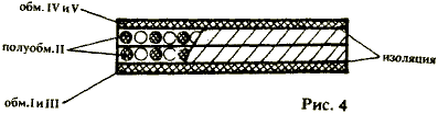 Для удобства пользования в устройстве предусмотрено два поддиапазона регулировки тока. ;Катушка трансформатора Т1 выполнена бескаркасной. Обмотка I отделена от остальных тремя слоями лакоткани. Обмотку II мотают в два провода, как показано на рис.4. Таким образом, получают четыре обомотки, после чего их "вызванивают" и принадлежащие к одной полуобмотке соединяют параллельно. Отвод получают соединением конца одной полуобмотки с началом другой.