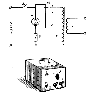 Основа сварочного аппарата первой конструкции - лабораторный трансформатор ЛАТР на 9 А (рис. 1). С него снимают кожух и всю арматуру на сердечнике остается лишь обмотка. В трансформаторе сварочного аппарата она будет первичной (сетевой). Эту обмотку изолируют двумя слоями изоленты или лакоткани. Поверх изоляции наматывают вторичную обмотку - 65 витков провода или набора проводов общим сечением 12-13 мм . Обмотку укрепляют изолентой. Трансформатор устанавливают на изолирующей подставке из текстолита или гетинакса внутри кожуха из листовой стали или дюралюминия толщиной не более 3 мм. В крышке кожуха, на задней и боковых стенках делают отверстия диаметром 8—10 мм для вентиляции. Сверху укрепляют ручку из стального прутка. На переднюю панель выводят индикаторную лампочку, выключатель на 220 В, 9 А и клеммы вторичной обмотки — к одной из них присоединяют кабель с держателем электродов, к другой — кабель, второй конец которого во время сварки прижимают к свариваемой детали. Кроме того, эта последняя клемма при работе обязательно должна быть заземлена. Индикаторная лампочка переменного тока типа СН-1, СН-2, МН-5 сигнализирует о включении аппарата. Электроды для этого аппарата должны иметь диаметр не более 1,5 мм. Для сварочного аппарата второй конструкции (рис. 2) необходимо изготовить трансформатор. Из Ш-образного трансформаторного железа набирают сердечник сечением около 45 см2, наматывают на него первичную (сетевую) обмотку — 220 витков провода ПЭЛ 1,5 мм. От 190-го и 205-го витков делают отводы, после чего изолируют обмотку двумя-тремя слоями изоленты или лакоткани. ![]() Рис. 1. Портативный сварочный аппарат (первая конструкция) Поверх изолированной первичной обмотки наматывают вторичную. Она содержит 65 витков провода или набора проводов общим сечением 25—35 мм2. В наборе лучше всего использовать провода типа ПЭЛ или ПЭВ 1,0—1,5 мм. Как и в первой конструкции, готовый трансформатор закрепляют на изолирующей подставке и помещают в кожух. Стенки кожуха должны быть удалены от трансформатора не менее чем на 30 мм. На переднюю панель кроме лампочки, выключателя и клемм выводят переключатель, регулирующий силу тока. В сварочном аппарате этой конструкции можно использовать электроды диаметром 1,5 и 2 мм. Электроды изготовляют следующим образом. Стальную проволоку соответствующего диаметра разрубают на куски длиной по 350 мм, зачищают шкуркой и покрывают обмазкой, состоящей из растолченного мела и жидкого стекла (силикатный клеи). Чтобы покрытие получилось ровным, проволоку вертикально погружают в обмазку, оставляя сверху чистый конец длиной 30—35 мм, и медленно вынимают, сразу же каждый электрод подвешивают на веревке с помощью бельевой прищепки. После высыхания электроды готовы к использованию. ![]() Рис. 2. Портативный сварочный аппарат (вторая конструкция) При работе необходимо надеть маску. Подключать этот