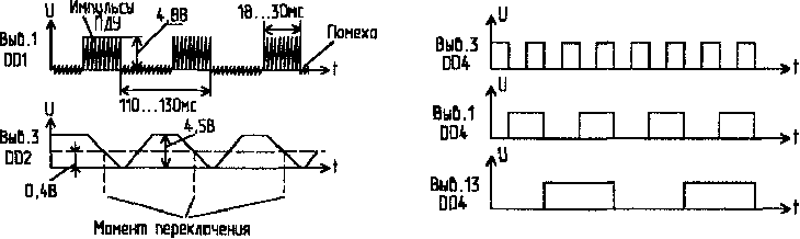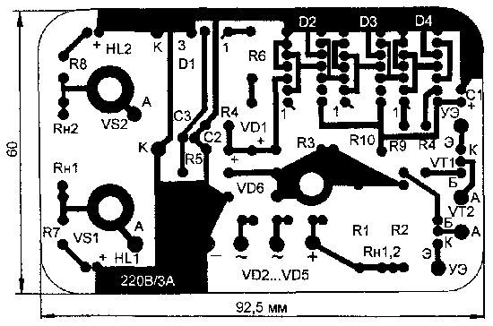В [1] описано устройство включения освещения при помощи любого пульта ДУ. Однако, на мой взгляд, устройство обладает низкой помехоустойчивостью. При управлении бытовыми приборами пультом ДУ, отраженный сигнал попадает на фотоприемник и вызывает ложные срабатывания. Кроме того, при длительном нажатии на кнопку ПДУ лампа освещения мигает с частотой около 5 Гц. На рис.1 приведено устройство дистанционного включения освещения, свободное от указанных недостатков. В исходном состоянии (при отсутствии команд с ПДУ) конденсатор С2 емкостью 0,47...1,2 мкФ заряжен примерно до напряжения 4,5 В. При облучении светодиода DD1 модулированным ИК-сигналом на его выводе 1 появляются пачки импульсов, которые разряжают конденсатор С2 до напряжения порядка 0,4 В (уровень логического "0"). После прохождения пачки импульсов, до прихода следующей, конденсатор успевает зарядиться. Таким образом, на входе С (вывод 3) элемента D2.1 появляется последовательность импульсов, которая вызывает переключение триггера. ![]() Рис.1. Принципиальная схема устройства дистанционного включения освещения На элементах D2.1...D3.2 собран делитель частоты на 16 (24), что обеспечивает помехоустойчивость устройства за счет введения задержки переключения примерно на 3 с. Последовательно включенные триггеры D4.1 и D4.2 обеспечивают переключение ламп, включенных в клеммы "RH1" и "RH2" по алгоритму: RH1—RH1 + RH2—RН2 — все погашены (и дальше по кольцу). Временные диаграммы работы устройства приведены на рис.2. ![]() Рис.2. Временные диаграммы Светодиоды HL1 и HL2 служат для индикации исправности цепи питания ламп. При погашеной лампе светится соответствующий светодиод. На элементах R1, R2, VD6 собран параметрический стабилизатор, необходимый для питания ИМС. Элементы R6, СЗ и R10, С1 образуют фильтры развязки по питанию для аналоговой и цифровой частей соответственно. Потребляемый самим устройством ток от сети не превышает 7...10 мА. От тока потребления ламп зависит тип применяемых тиристоров и диодного моста. При использовании указанных на схеме элементов мощность нагрузки на один канал не должна превышать 180 Вт, а на оба канала одновременно - 300 Вт, при этом диодный мост GBH415А необходимо установить на теплоотвод площадью около 25 см2. Указанные выше потребляемые мощности нагрузок соответствуют пятиламповой люстре с лампами мощностью 60 Вт каждая. Конденсатор С2 подбирают для соответствующего пульта ДУ (при необходимости). Чем больше емкость конденсатора, тем меньше радиус действия ПДУ, но выше помехоустойчивость. На рис.3 приведена печатная плата устройства. ![]() Рис. 3. Печатная плата Конструктивно устройство размещается в корпусе, изготовленном из полупрозрачной мыльницы. Вместо ИМС К561ТМ2 подойдут К176ТМ2, 564ТМ2. Фотоприемник IFMS5360 производства НПО "Интеграл" можно заменить на TFMS5360, TFMS5380 фирмы Philips. Импортный диодный мост GBH415A заменять допускается лишь на диоды с номинальным током не менее 4 А и обратным напряжением не ниже 400 В (например, КД202Р). Единственным недостатком устройства является невозможность включения его в разрыв провода питания лампы, вместо штатного выключателя. Однако это не вызывает существенных неудобств при его установке вблизи разветвительной коробки, в которой соединяются провода, идущие к выключателю и люстре. Схема имеет бестрансформаторное питание от сети, поэтому при наладке следует соблюдать остор