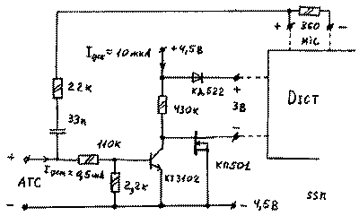 Возможно при наличии фона понадобится зашунтировать сток-исток полевого транзистора конденсатором, но в моЈм варианте этого не понадобилось, всЈ и так хорошо работает. Питание АТС - 60 вольт, но должно работать и при 48B. Сопротивление телефона по постоянному току должно быть 800-600 Ом или ниже, потребление тока от АТС 0,5 ма (норма 1-2 ма), источик питания ни в коем случае не следует заземлять - в моЈм варианте схема питается от 3 элементов AAA, при запитки от 3х акумуляторов диод следует исключить или заменить на германевый.