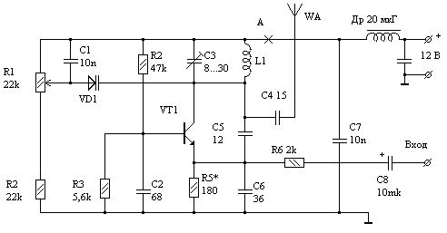 Принципиальная схема передатчика содержит один транзистор VT 1 типа КТ603Г. В качесте VD1 использован КВ109Г. Передатчик настраивают на частоту одного из свободных от телевизионного вещания каналов (например, 1....5 канал). Подстройка осуществляется с помощью подстроечного конденсатора С 4, которым добиваются захвата немодулированного сигнала. Точная настройка передатчика производится резистором R1. Сигнал от видеоприбора подается на вход передатчика в цепь эмиттера транзистора через резистор R6 и конденсатор С9. Промодулированный видеосигнал с коллектора поступает на колебательный контур L1 С4 в антенну. Ток в точке А подбирается в пределах 30....35 мА.