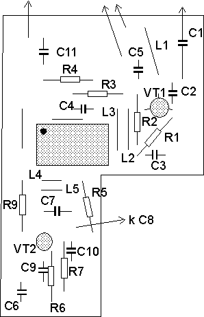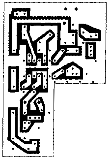 Конвергер питается стабилизированным источником питания 9...12 В. Потребляемый ток - не более 30 мА. Конструктивные данные катушек приведены на рис.2, чертеж печатной платы в масштабе 1:1 - на рис.3. В конвертере применены резисторы типа C1-4-0,125; конденсаторы C1, C2, СЗ, С9, С10 - типа КД-2, конденсаторы С4, С5, С6 - типа К10-7Б, конденсатор С7 - типа КТ-23 8/30 пФ, конденсатор С8 - от УКВ блока приемника "Океан". Детали конвертера размещены на односторонней печатной плате из фольгированного стеклотекстолита толщиной 1 мм. Конвертер помещен в корпус стандартного блока СКД. Каскад гетеродина отделен от остальной части конвертера перегородкой из жести. Наладка конвертора сводится к на стройке гетеродина на нужные частоты. При максимальной емкости конденсатора С8 медленным вращением конденсатора С7 добиваются приема 21-го канала на 1-й канал, а при минимальной емкости конденсатора С8 медленным вращением конденсатора С7 добиваются приема 60-го канала на 12-й канал. При такой настройке все каналы дециметрового диапазона попадают в полосу преобразования конвертера. Литература: 1. Радио. - 1989. - N2. - С.26. 35. В.КОРОБЕЙНИКОВ |