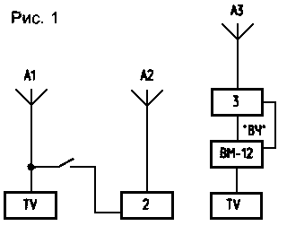 В отечественных ВМ имеется выход "ВЧ", он позволяет производить трансляцию программы на антенный вход телевизора, включенного на 6-й канал метрового диапазона. Усилив сигнал, можно передавать его на расстояние несколько сот метров. Прием ведется на обыкновенный телевизор, для чего используется отдельная антенна А2, ориентированная на передающую антенну A3. Последнюю желательно установить как можно выше, например на крыше дома. Принятый сигнал для более уверенного приема усиливается антенным усилителем, принципиальная схема которого приведена на рис.2.
