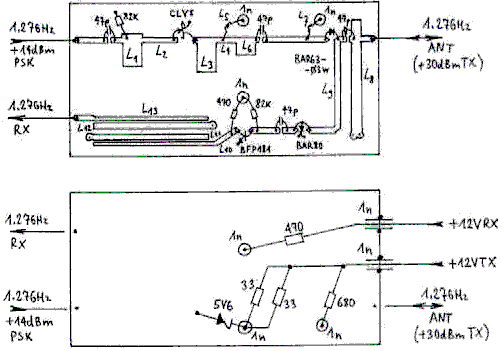 Внешний интерфейс RF ускорения переключения TX/RX, смесители приёмника включено и получает LO, сообщают о всем времени. С другой стороны, сигнал LO, питающий модулятор должен быть выключен, чтобы избежать любого вмешательства в течение приема. Поэтому сигнал LO питается от смесителя приёмника через направленный сцепной прибор, расположенный в 1270MHz PSK модуле модулятора как показано на Рис.6. 23cm PSK приемопередатчик, показанный на Рис.9., включает TX усилитель мощности с CLY5 мощью GaAsFET, чтобы повысить мощь вывода TX относительно 1W (+30dBm), выключатель антенны диода разьёма (BAR63-03W и BAR80) и приёмный усилитель RF с BFP181. Последний имеет относительно 15dB усиличения, но следующий 1.27GHz BPF имеет относительную 3dB диапазонную потерю. Внешний интерфейс RF также построен как схема микрополосы на двухстороннем PCB как показано на Рис.10. и Рис.11. Квадратура I/Q смесителя для 1270MHz, показанной на Рис.12., включает дополнительную стадию усиления для 1.27GHz (26dB MMIC INA-03184), два диапазонных фильтра на 1.27GHz (3dB потеря вставки каждый), гибрид квадратуры для RF сигнала в 1.27GHz, мощьность splitter для сигнала LO на 635MHz, два идентичных подгармонических смесителя (два BAT14-099R schottky четверки) и два идентичных IF preamplifiers (два BF199). Так как завершение impedances подгармонических смесителей зависит от мощности сигнала LO, порты различия и квадратуры (RF) и мощьность (LO) splitters должны быть закончены, чтобы гарантировать правильную стадию и отношения амплитуды. Рассматривая производственные терпимость микрополосы PCB показанный на Рис.13. и Рис.14., амплитуда, соответствующая - обычно в пределах 5%, и сдвиг стадии - в пределах +/- 5 градусов от номинала 90 градусов.