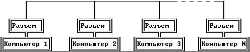Локальная вычислительная сеть "Витая пара" работает по обычной двупроводной линии. В качестве линии может быть использована витая пара проводников, а также экранированный двупроводный кабель или любая другая пара проводников. При этом компьютеры в сети подключаются по схеме "общая шина". Конфигурация сети может быть как в ниже приведенном примере.