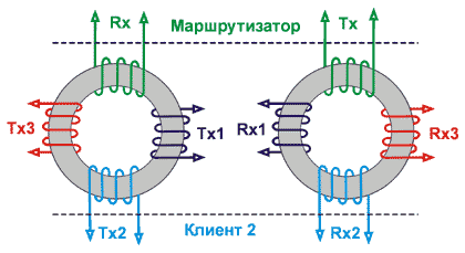 Принцип действия прост - на трансформаторе происходит "разветвление" сигнала на нескольких пользователей. Аппаратного механизма обнаружения коллизий, естественно, нет, и эту функцию приходится брать на себя протоколу верхнего уровня. Поэтому скорость при одновременной работе пользователей, подключенных к одному трансформатору, сильно снижается.