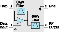 Блок-схема передатчика HX1000 представлена на рис. 1. Генератор выполнен на усилителе с ПАВ фильтром в цепи обратной связи. Другой идентичный фильтр на ПАВ используется для подавления гармоник в выходном сигнале. При передаче используется 100-% амплитудная модуляция.