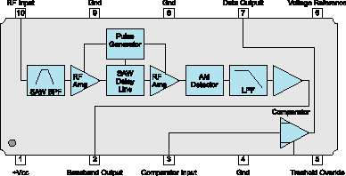 ASH-тракт (рис. 2) состоит из входного антенного ПАВ-фильтра, первого и второго усилителей ВЧ, работающих с временным разделением, и промежуточной линии задержки на ПАВ. Задержка составляет около 0,5 мкс. УВЧ1 и УВЧ2 работают попеременно, в противофазе, через линию задержки, что исключает перекрёстную связь при больших коэффициентах усиления, так как цепь усиления разорвана во времени. Выход УВЧ2 подключен через амплитудный детектор к ФНЧ с шириной полосы 2–150 кГц, откуда НЧ-сигнал поступает через внешний конденсатор на компаратор, формирующий цифровую последовательность.