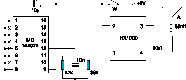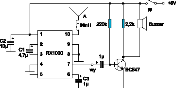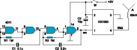 В схеме передатчика, кроме уже описанной микросборки HX1000, применён модулятор на микросхеме CD4011 (К561ЛА7). Два первых элемента ИЛИ-НЕ работают как “ключевой” генератор. Его выходной сигнал управляет звуковым генератором. Время действия “ключевого” импульса можно изменять корректировкой значений R1 и С1, а тон звукового сигнала — R2 и С2. К выходу приёмника RX1000 подключен усилитель на транзисторе Т1 с пьезокерамическим излучателем.