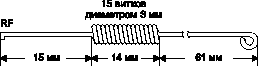 Нижняя часть антенны упрочнена при помощи изолирующей втулки и водостойкого клея и припаяна непосредственно к ножке микросборки. Полная длина антенны, вместе с катушкой индуктивно-стью около 68 нГн, составляет 90 мм. Эскиз антенны, с размерами, подобранными для частоты 433,92 МГц, показан на рис. 7. Для питания использованы две пальчиковые батарейки, но можно использовать и миниатюрные элементы CR2032. Реальный радиус действия такой системы составил около 250 м на открытой местности.