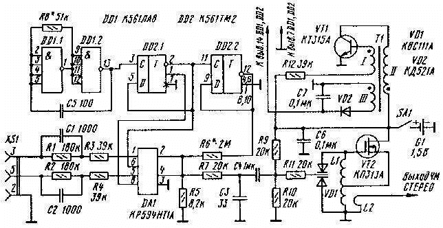 Принципиальная схема стереопередатчика приведена на рисунке. Он состоит из задающего генератора на микросхеме DD1, делителя частоты вырабатываемых генератором импульсов на микросхеме DD2, балансного модулятора на микросхеме DA1 и ЧМ УКВ генератора на транзисторе VT2. Транзистор VT1 работает в каскаде преобразователя напряжения для питания цифровых микросхем.