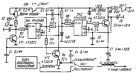 Оно выполнено на транзисторах VT1-VT3 и операционных усилителях DA1 (повторитель), DA2 (компаратор). При переводе переключателя SA1 в положение "Сканирование" питание на варикап ГПД трансивера поступает не с узла расстройки, а с эмиттерного повторителя сканирующего устройства. При этом в точку 1 платы 5 трансивера подается пилообразное напряжение отрицательной полярности амплитудой около 27В (рис. 2).