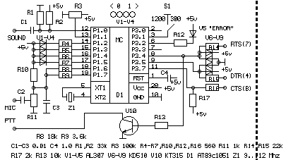 На диодах V6-V9, резисторах R14-R17 собрана схема сопряжения уровней TTL с уровнем сигналов COM порта компьютера. На схеме указаны названия сигналов порта и нумерация 9-ти выводного разъема компьютера для работы с известной пакетной программой BAYCOM. Она позволяет работать как на КВ так и на УКВ. Если предполагается подключить модем к TNC контроллеру, схему сопряжения можно исключить. В этом случае сигналы подключают соответственно: вывод 8 процессора к выходу прием/передача TNC, вывод 11 к входу демодулированных данных в TNC, вывод 9 к выходу данных из TNC. Сигналы SOUND, MIC, PTT подключают к радиостанции соответственно на НЧ выход, на микрофонный вход, и на вход управления прием/передача.